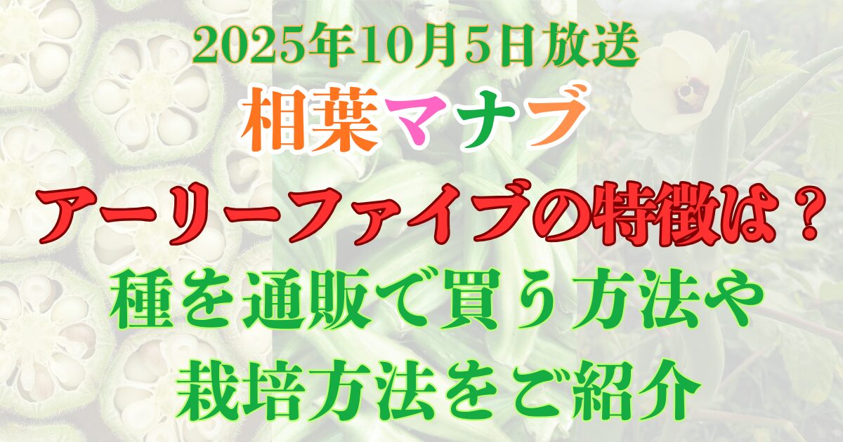 2025年10月5日放送「相葉マナブ」で話題のオクラ、アーリーファイブについてご紹介します。五角オクラの中でも人気なアーリーファイブ。柔らかくて強いねばねば感があるという特徴があります。 本文では、アーリーファイブの種を購入する方法や、栽培方法... -
